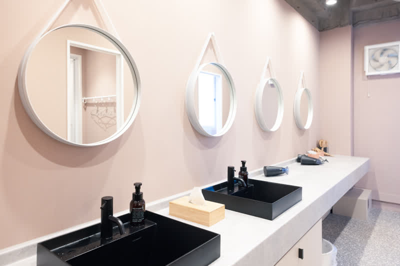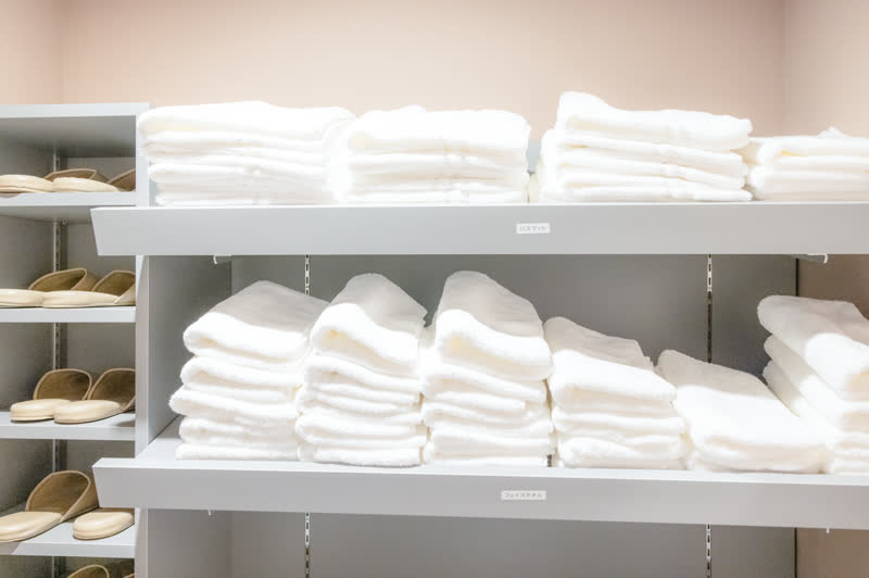 シャワールームでは、ハンドタオル、バスマット、シャンプー、コンディショナー、ボディソープ、クレンジングオイル、綿棒・コットン、歯ブラシ、くし、ドライヤー、ヘアアイロンが常備されています。
