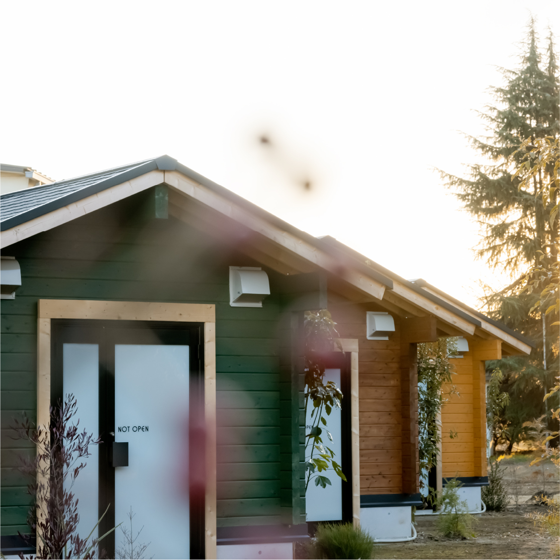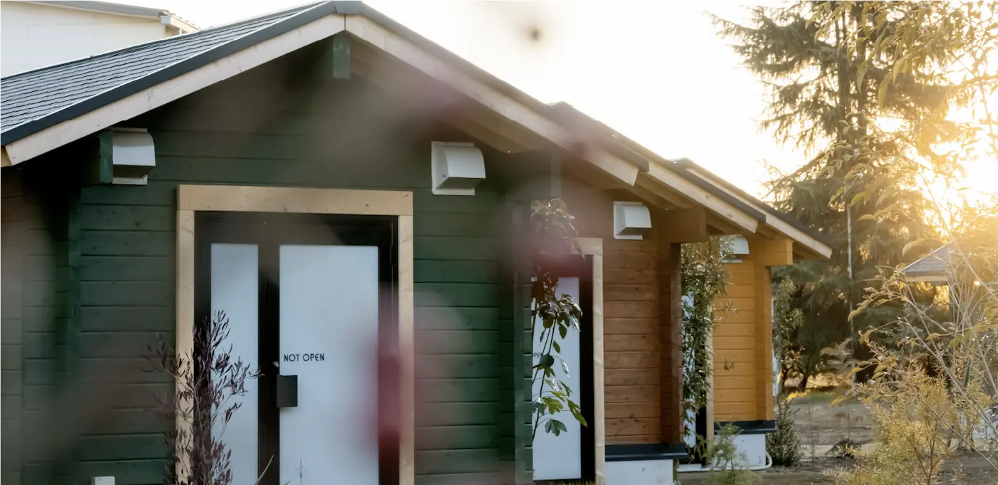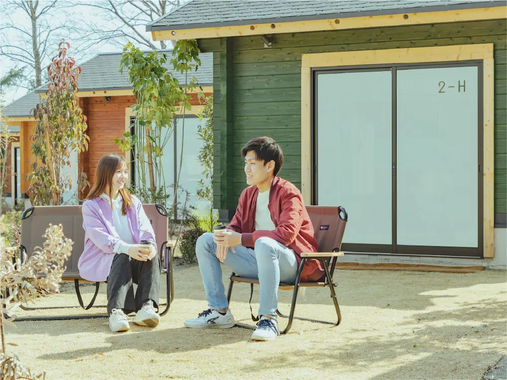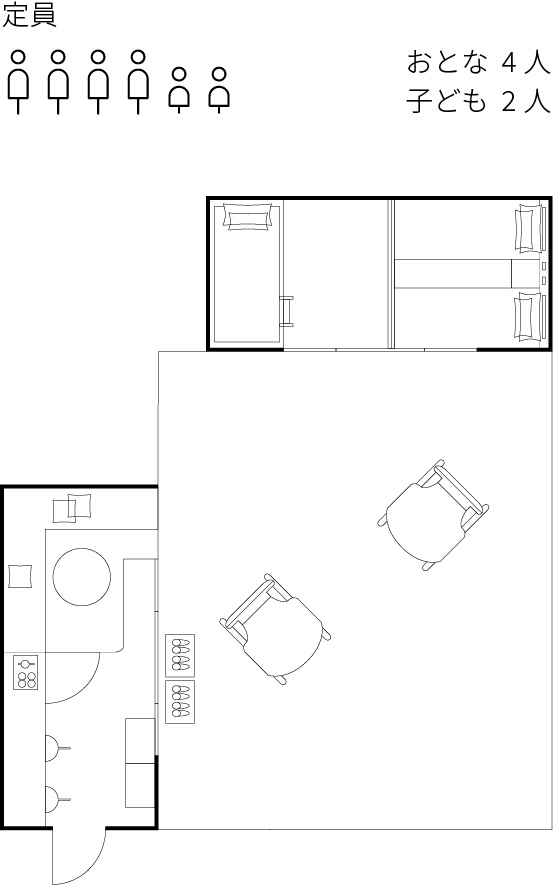 4beds cabinは6区画のご用意があります。寝室棟とリビング棟が分かれた宿泊居室となっております。グループやファミリーでのご利用にお勧めです。寝室のベッドは平置き2台、2段ベッド1台となっており、平置きベッドはシングル2台の「セパレートタイプ」とキングサイズ1台の「キングタイプ」からお選びいただけます。お子さまをお連れの場合は大人4名+お子さま2名の合計6名までのご利用が可能です。