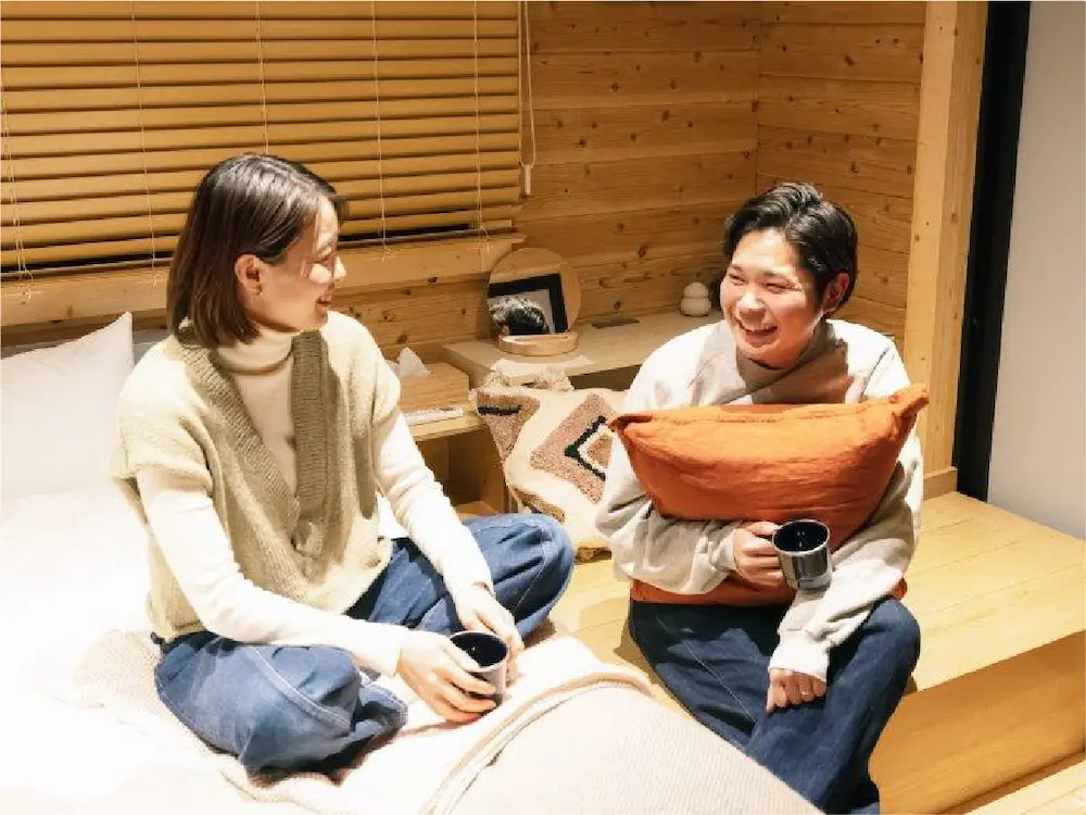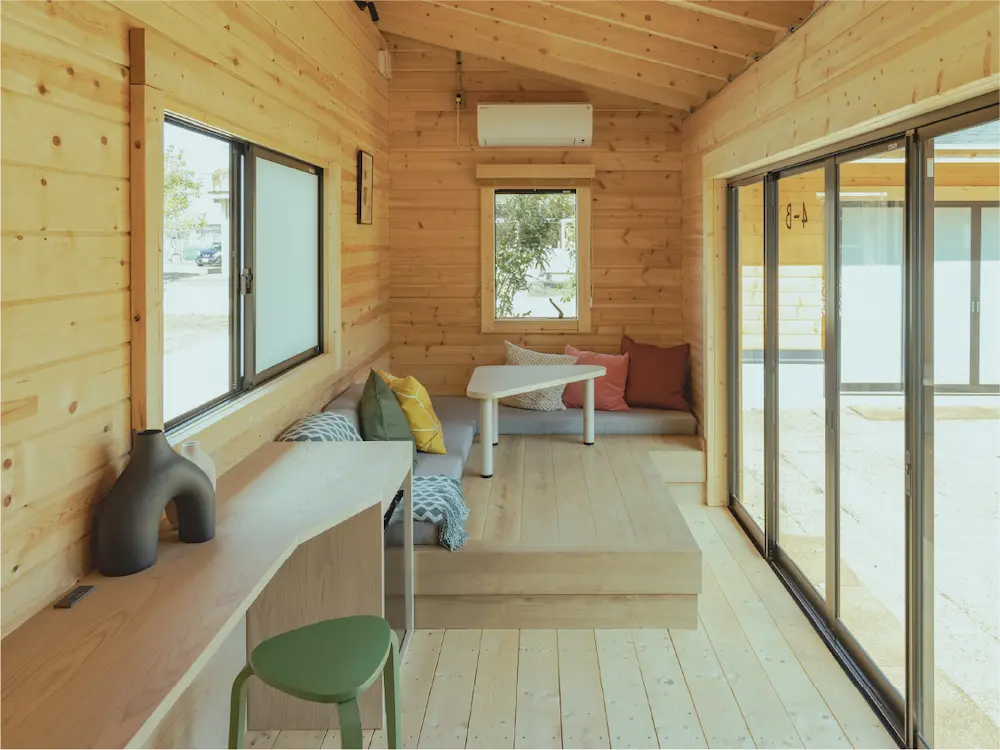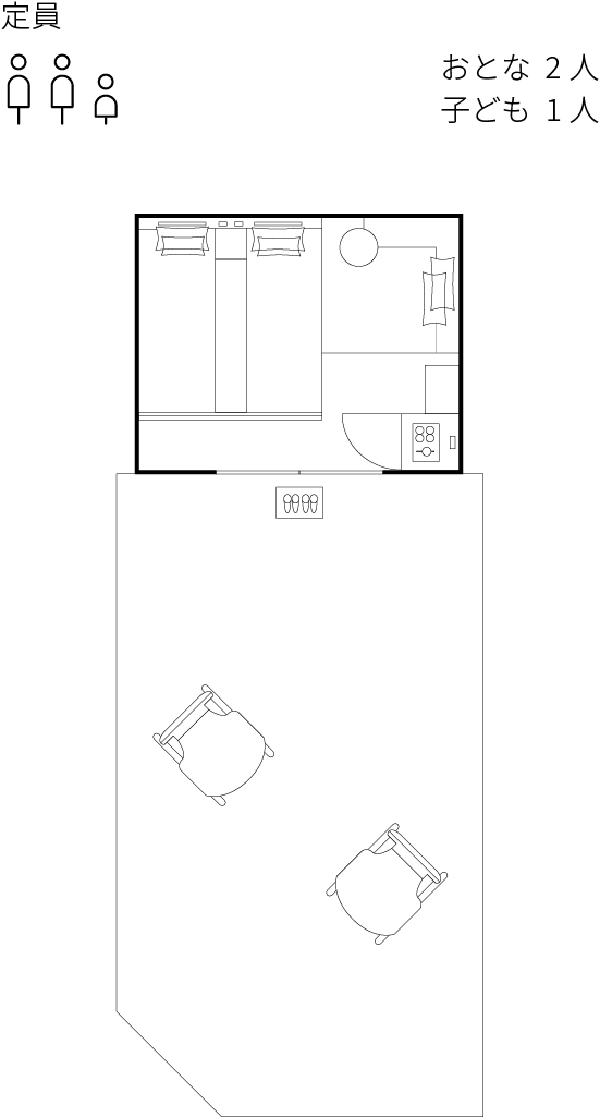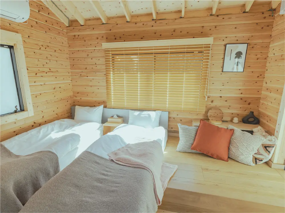 2beds cabinは9棟のご用意があります。寝室とリビングが一体型のシンプルでコンパクトな宿泊居室のためカップルでのご利用などにお勧めです。ベッドはシングル2台の「セパレートタイプ」とキングサイズ1台の「キングタイプ」からお選びいただけます。お子さまをお連れの場合は大人2名+お子さま1名の合計3名までのご利用が可能です。