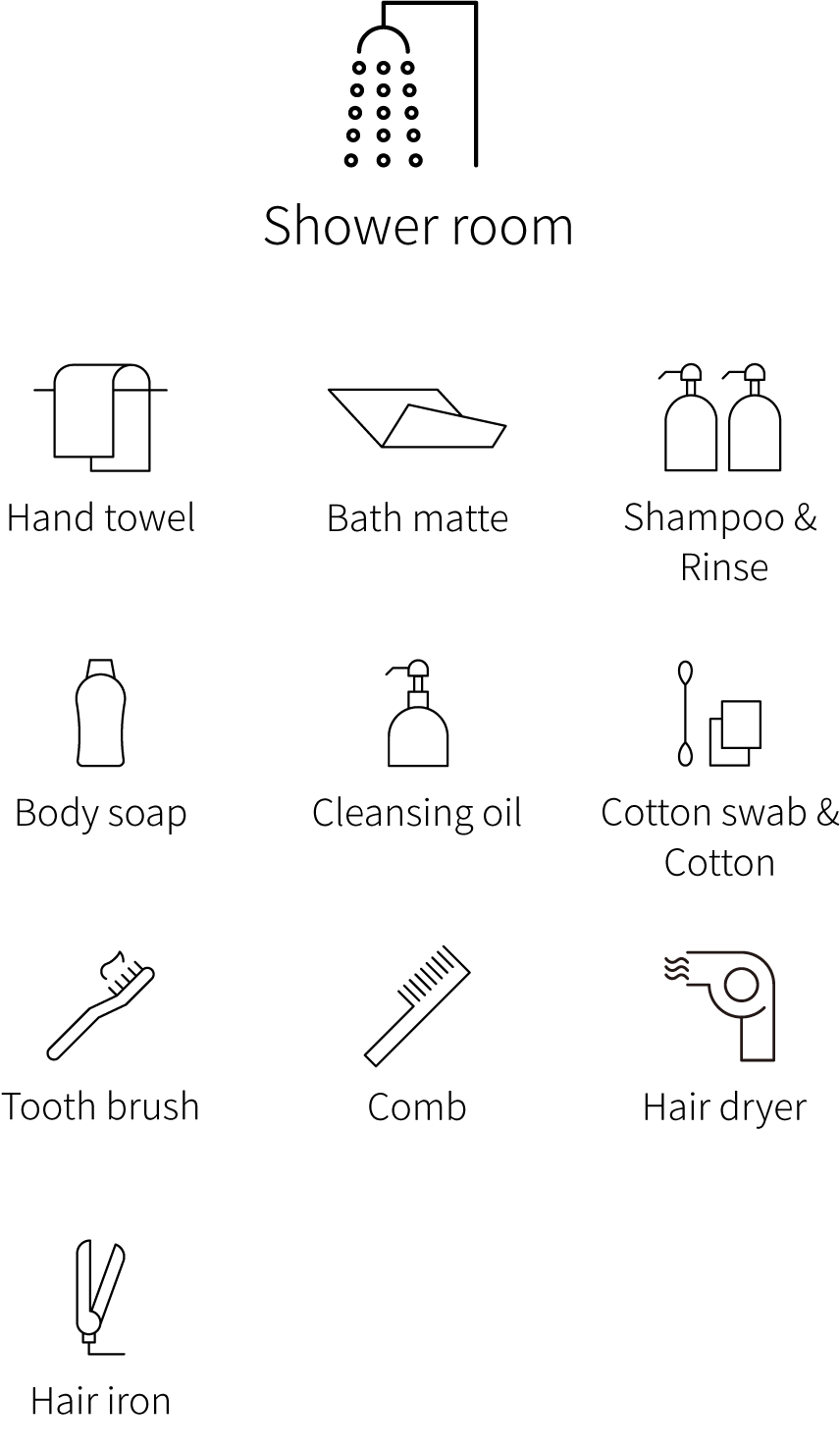 ハンドタオル/バスマット/シャンプー/コンディショナー/ボディソープ/クレンジングオイル/綿棒・コットン/歯ブラシ/くし/ドライヤー/ヘアアイロン