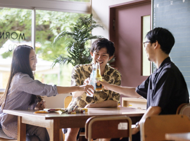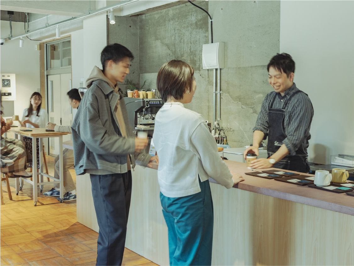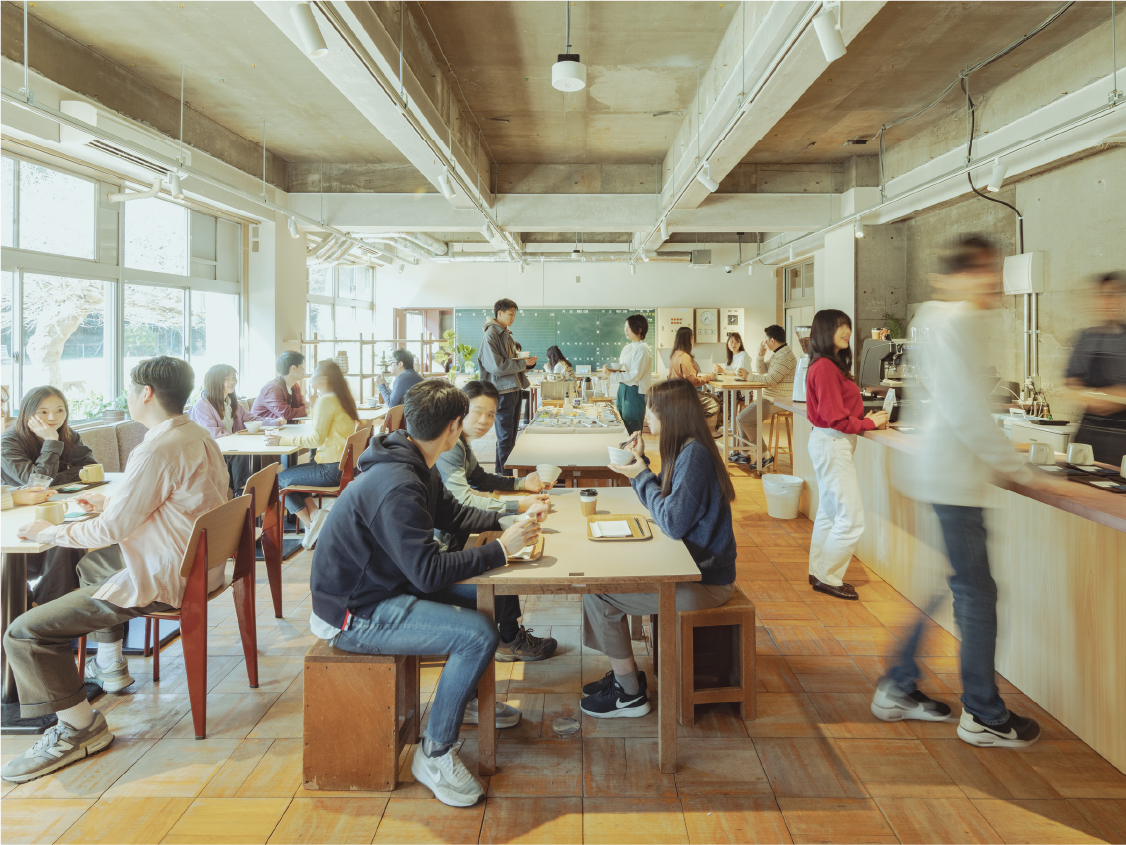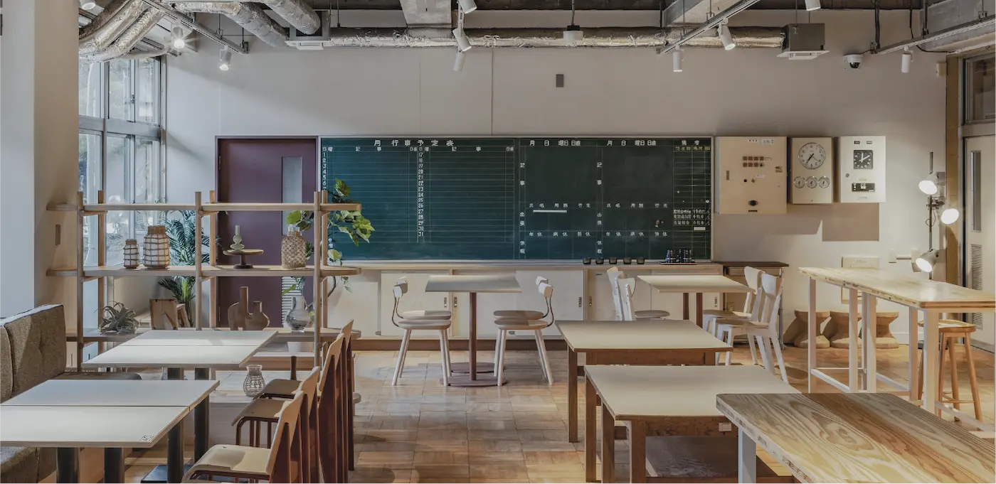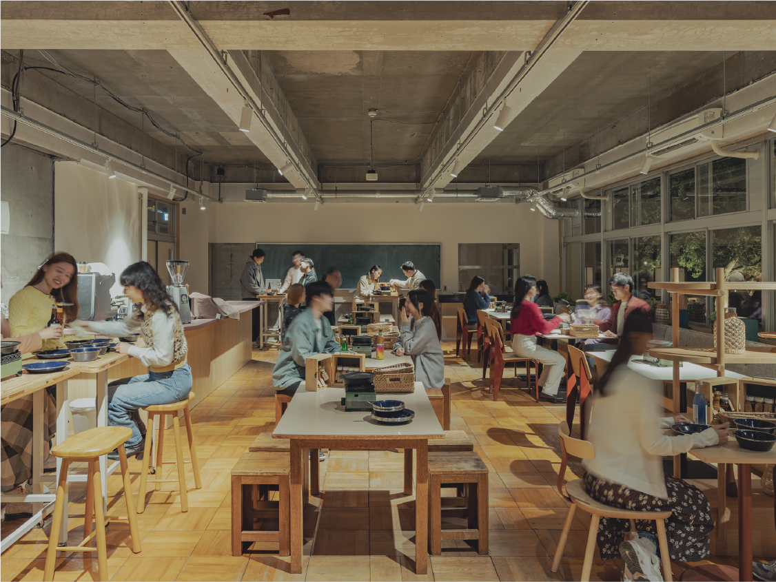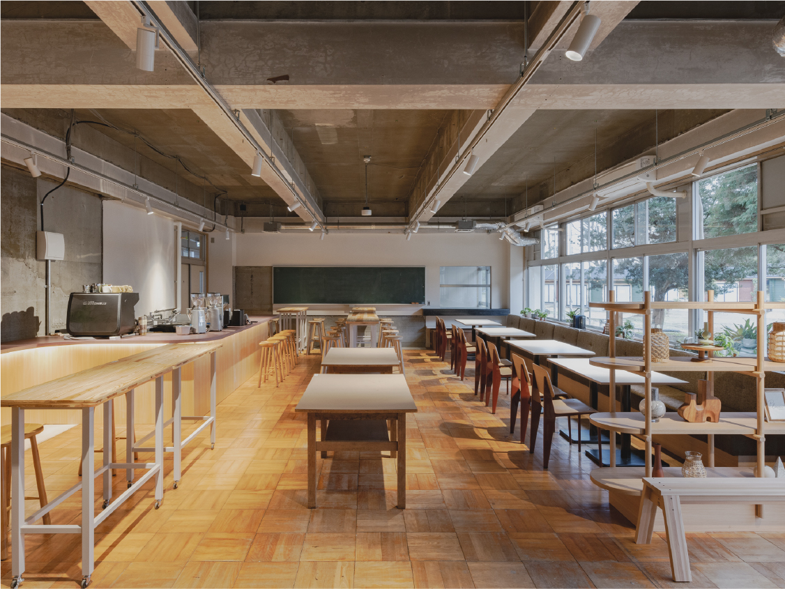 ゲストの憩いの場としてカフェラウンジをご用意しました。BBQの後に、思い思いのお酒を片手にたくさんの「会と話」をお楽しみください。また、翌朝のモーニングタイムには地元木更津で愛されるコーヒーショップ『 THE COFFEE 』 ゲストの憩いの場として、旧職員室をカフェラウンジとしてご用意しております。BBQの後に、思い思いのお酒やおつまみを携えてリラックスできる空間です。