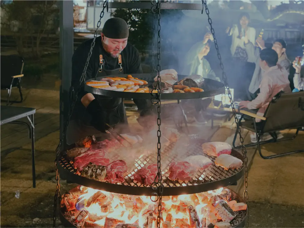 ETOWA KISARAZUのディナーは豪快なBBQです。BBQサイトの中央に位置するセンターピットでは大迫力の火力で、塊のままお肉をシェフがお焼きし、目の前でカッティングをしてサーブします。季節に合わせたBBQのメニューをお楽しみください。”目でも舌でも楽しめるBBQ”がここにはあります。