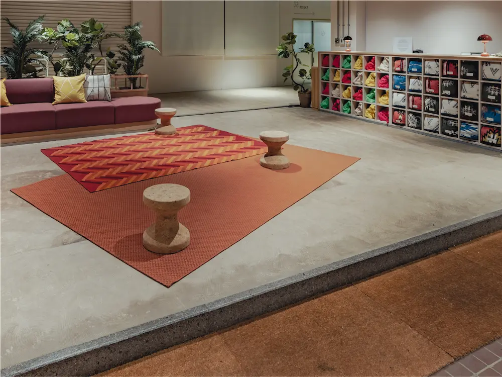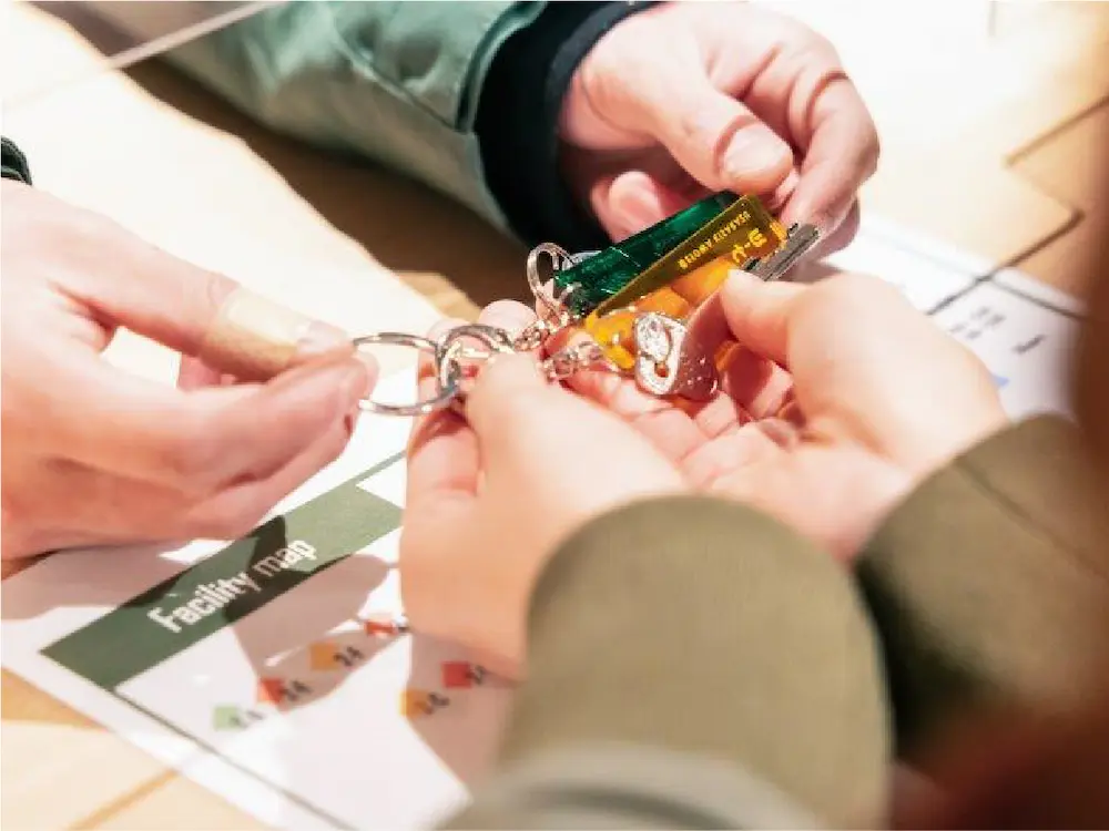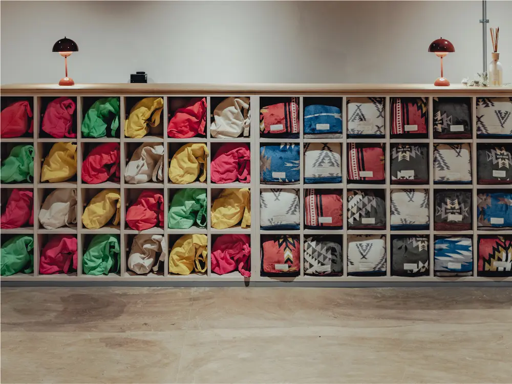 元々小学校で使われていた下駄箱をリノベーションしたフロントデスクが受付の目印。おしゃれな家具と観葉植物の清潔な空間がお出迎えします。貸し出し備品のご用命など、御用の際はこちらにお越しくださいませ。