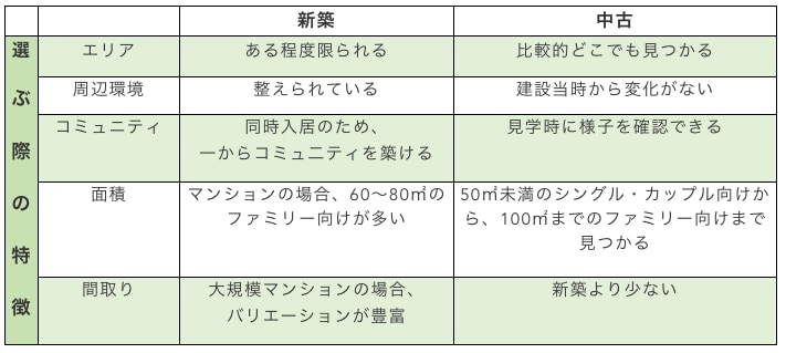また、新築と中古物件では、選択肢の多いエリアや周辺環境の特徴が異なります。それぞれの特徴を考慮して、心地よく暮らせる住まいを選択しましょう。