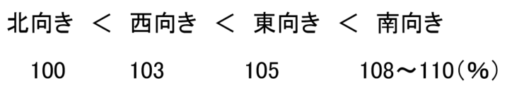 北向きの部屋を基準の100%とすると、西向き・東向きの順に数パーセントずつ高くなり、南向きの部屋では約10%も値上がりする傾向があります。マンションを探している方は、日当たりが価格や不動産評価に影響することを考慮しましょう。