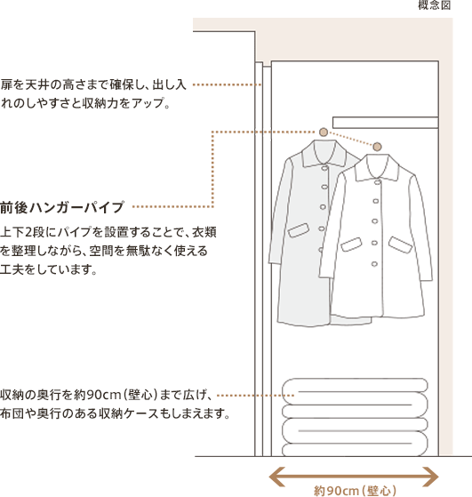 以下の図のように、収納スペースの奥行きが90センチメートル以上の場合は、ハンガーパイプを上下二段に設置することでより多くの衣類をかけられます。すぐ使う衣類は手前に、使わない物は奥に収納すれば出し入れが容易です。
