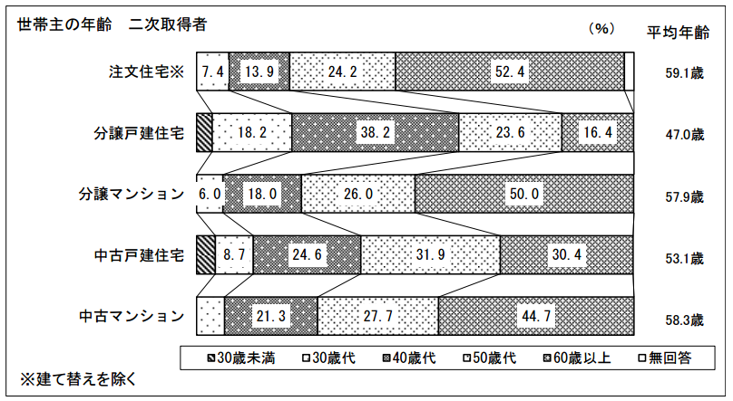 近年では、老後に備えての住み替えをするシニア世代が増加していることをご存じでしょうか。以下の図では、各物件を2回目以上購入する「二次取得者」の年齢ごとの割合を示しています。