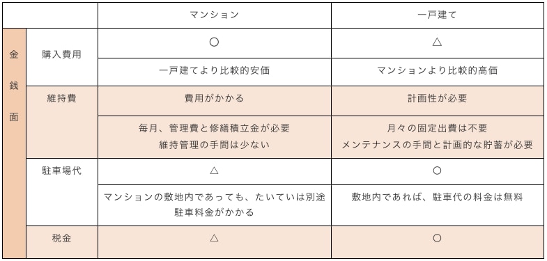 マンションと一戸建てにおける金銭面の違いは、以下の表にまとめています。