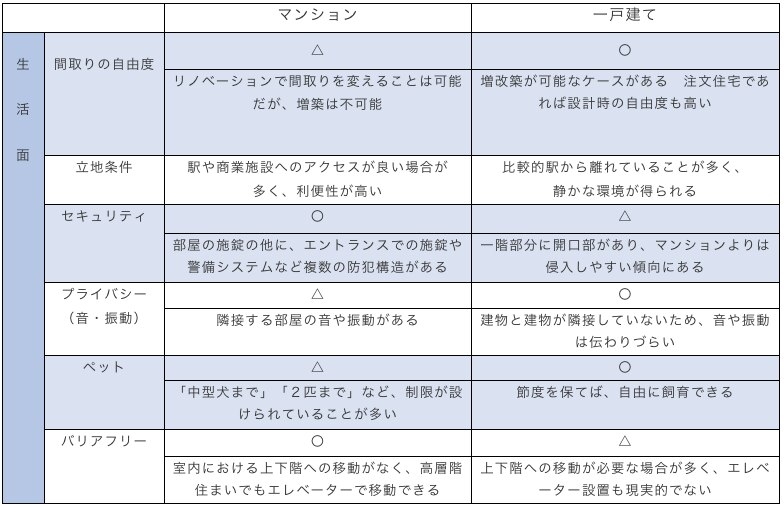 | 室内における上下階の移動がなく、高層階の住まいでもエレベーターで移動できる | 上下階の移動が必要な場合が多く、エレベーターの設置も現実的でない | ||