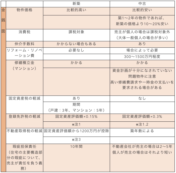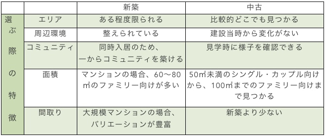 新築と中古物件の各項目における特徴は、以下の表に示しています。