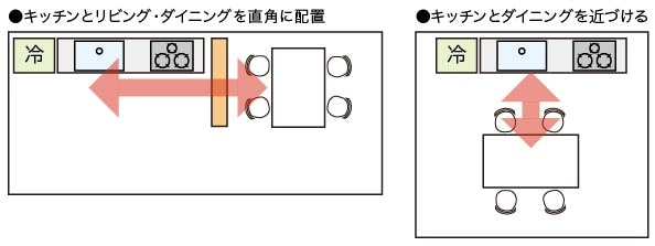 コミュニケーションの取りづらさは、キッチンの向きをリビング・ダイニングと直角に配置することで改善できます。また、ダイニングテーブルとの距離を近づければコミュニケーションを取りやすくなります。