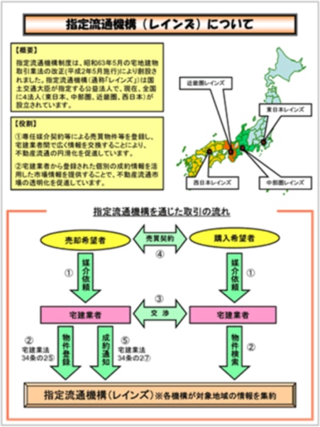 指定流通機構とは、レインズ(Real Estate Information Network System=REINS)と呼ばれ、宅地建物取引業法に基づいて国土交通大臣が指定した不動産流通機構です。現在全国に4法人(東日本、中部圏、近畿圏、西日本)が設立されており、不動産流通の活性化を図るためそれぞれの地域の物件情報の交換業務などを請け負っています。