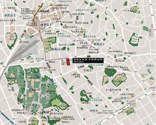 計画地は、大田区のほぼ中央に位置する「大田区中央」の住所において、中でも、「中央5丁目」の、周囲を一望する見晴らしの良い高台に立地しています。池上本門寺を始めとした周辺の豊かな自然環境と、都営浅草線始発駅「西馬込」駅から徒歩9分の高い利便性を兼ね備えた稀有な立地特性を有しています。