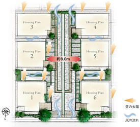 敷地面積 94.05m²〜126.44m²の全33区画からなる大規模な街づくりを特徴としています。「街」は全体として調和を図りつつも、建物外観(外壁・門柱)と外構計画(シンボルツリー・植栽)の特徴がそれぞれに異なる5つの「住区」で構成し、街並みに印象の変化を演出しています。 また、A-D住区内は、良好な街並み景観を阻害する電柱を地中埋設しています。