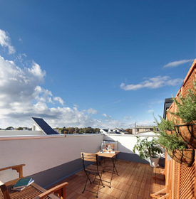 高台の立地特長をより生かすため、屋上に「スカイバルコニー」を設置(一部住棟除く)しています。スカイバルコニーにはスロップシンクを設け、ガーデニングやアウトドアリビングとしても利用できます。また、「軸組在来工法」を採用することで、リビングを始めとした居室に背の高い窓やコーナー部分に出窓を設置し、明るく開放感のある室内空間を実現しています。 |