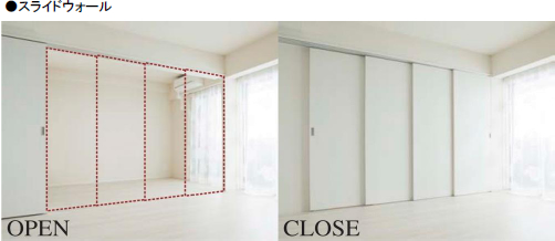 [特徴(1)]可変性のあるスライドウォール付プラン一部住戸のリビング・ダイニングと洋室の間にスライドウォールを採用したプランをご用意。子どもの成長する過程、将来独立し夫婦のみでの生活等、ライフスタイルの変化に対応できる住空間を提案します。