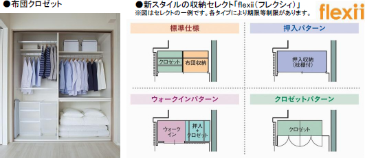 [特徴(3)]住まう方のニーズに応える新しいスタイルの収納をご提案単に収納スペースを確保するだけでなく、家族それぞれのニーズに合った機能的な収納へ。そんな発想から、布団もしまえる収納、用途に応じて選べるクロゼットなど、新しいスタイルの収納をご用意しました。
