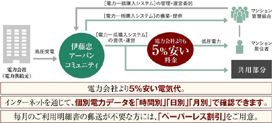 専有部の電気代を5%安く提供する電力一括受電システムを構築。 環境配慮を意識し、マンションの省エネや節電にも取り組んだ「電力一括受電」システムを構築しました。これは、伊藤忠グループの総合力を活かし、電力供給を電力会社に代わり代行会社(伊藤忠アーバンコミュニティ)が行うことで、単価の安い高圧電力と単価の高い低圧電力から差額を生み出し、電力会社より電気代を5%安く提供するもの。マンションの専有部での電力を安くご利用できるように計画しています。