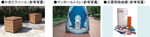 通常はベンチとして利用でき、災害時には「かまど」としても利用できる「かまどスツール」をはじめ、マンホールの蓋を外してその上に組み立てる簡易トイレ「マンホールトイレ」等、万一に備えた防災設備・用具を備えています。