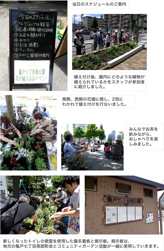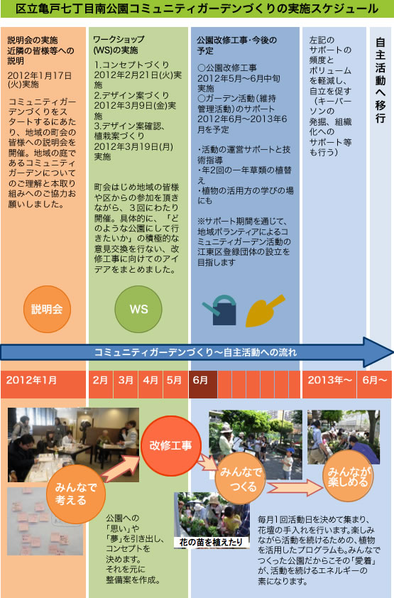 本取り組みは、公園を管理する江東区の了解のもと、区が推進するコミュニティガーデンづくりの考え方に沿って、民間事業者が地元の声を伺うワークショップの開催や公園改修工事、工事後の区民参加による公園維持管理活動に向けたボランティア育成までをサポートするという、東京都では初めての官民協働によるコミュニティガーデンづくりです。