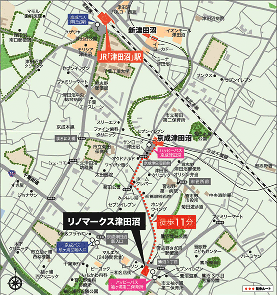・総戸数:65戸、他に管理事務室1戸、集会室1戸 ・構造・規模:鉄骨鉄筋コンクリート造・地上8階建 ・敷地面積:3,224.70m² ●『リノマークス津田沼』までのアクセス