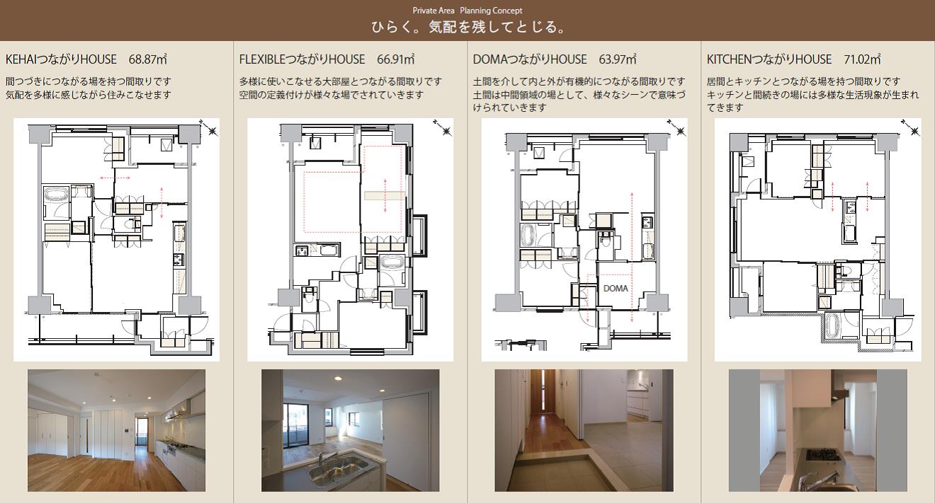 現在でも、分譲マンションにおける60〜70m2台の3LDKの間取りはかなり画一的である。オークプレイス月島では、その間取りという根本的な課題に対して提案している点がまず評価できる。基本的には引き戸を多用し、室の連続性を居住者が調整可能なものとすることで、多様な住こなしを可能にしている。図面にあるDOMAと記された空間はエントランスと同じレベルである方がよりコンセプトが明快で多様な住みこなしを誘導するように思える。