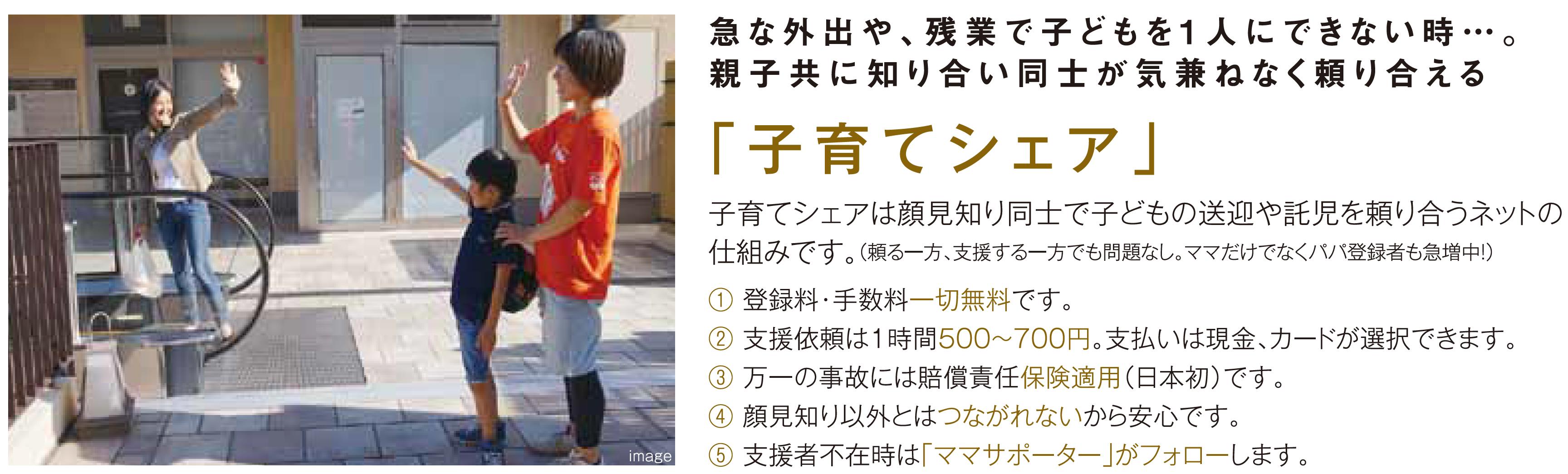 顔の見えるリアルな地域交流の場づくりと、子どもの送迎や託児を信頼できる顔見知り同士が、1時間単位の料金で頼り合えるオンラインの仕組み「子育てシェア」(登録料・手数料無料。全支援者に保険適用)を運営しています。