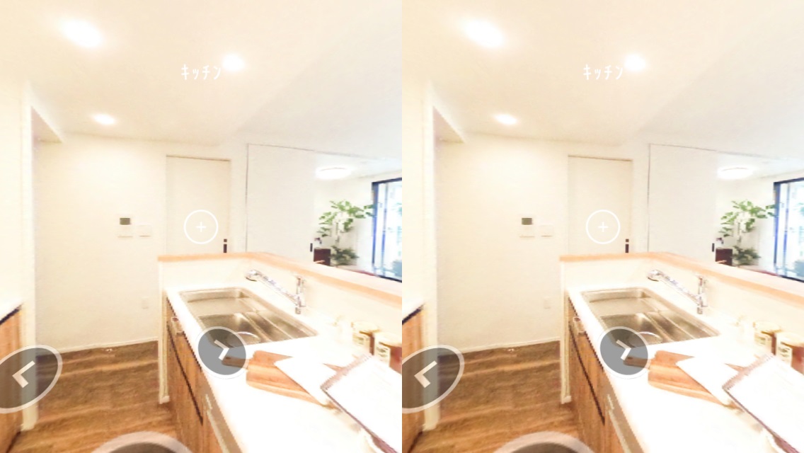 - ダンボール製キットを組立て、スマートフォンをセットして覗くと、モデルルームの内観が広がります。本体を上下左右に動かすことでまるでその場にいるかのように、360°室内を疑似体験することができます。中央にはカーソルが浮かび上がっており、本体を動かして画面に浮かぶ矢印や虫眼鏡のサインに合わせることで、部屋の移動や、各部屋のこだわりポイントの解説を読むことができます。