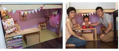 押し入れの扉を外し下段を子どもの秘密基地にしました。内部はラベンダー色のペンキを塗りました。このペンキは以前ライフinfoで特集されていたウォールデコレーションストアさんに家族で行ってペンキ塗りの体験をし購入したものです。おままごとのミニキッチンを中に入れて前に収納も兼ねたカウンターを置き、反対側の壁には鏡やフックを付けお姫様に変身出来る空間にしました。初めてのペンキ塗りでいろいろ大変でしたが、子どもの笑顔を見るとやって良かったと思います。これからも家族が楽しめるカスタマをしていきたいです。