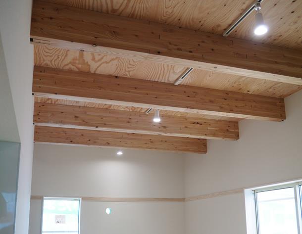1階天井部分は「カラマツ」の梁を見せるデザインとし、天井高約2.8mの開放的な空間を実現。さらに、