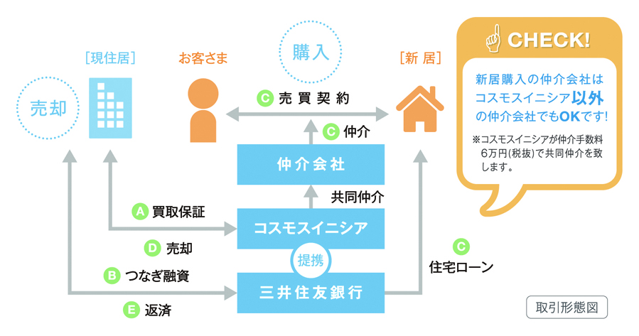 (C)上記A・Bを経て、新居のご契約を締結します。新居の住宅ローンも株式会社三井住友銀行が融資します。なお新居購入に際しての不動産会社は、コスモスイニシアとの共同仲介を前提に、コスモスイニシア以外の仲介会社または販売会社でも可能です。
