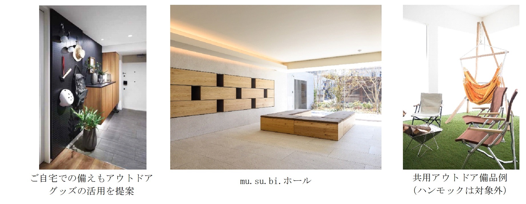 1階のmu.su.bi.ホール(エントランスホール)は、多彩な交流を生み出す共用空間です。コミュニティ醸成の場となることに加え、ラウンジの壁面に設けた棚やベンチ下収納には、ご入居者のみなさまにご使用いただけるアウトドア用品を備えます。キャンプやバーベキューなどの際に貸し出すほか、万一の防災備品としての役割も担います。