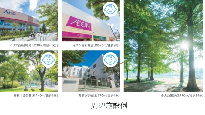 本物件は、東京都足立区島根4丁目・東武伊勢崎線「西新井」駅から徒歩9分に立地し、周辺には多彩な商業施設、子どもの好奇心を大きく育てる複合文化施設「ギャラクシティ」、バーベキューもできる「舎人公園」など、商業・文化・潤いを身近に感じられる生活施設がそろっています。
