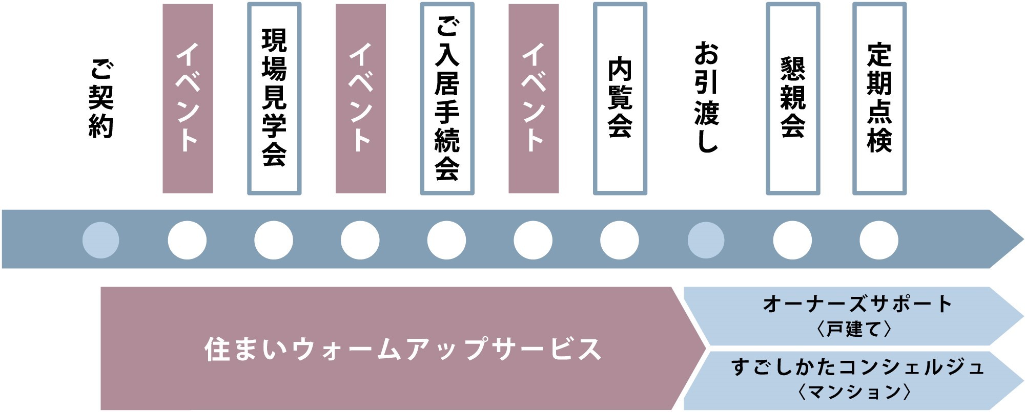 『住まいウォームアップサービス』は、ご契約からお引渡しまでの間を、お客さまが安心して新生活にスムーズに移行していただくための準備期間として、また新生活への期待やワクワク感をもっと膨らませて楽しんでいただける期間になるように、各種イベントをパッケージ化したサービスです。