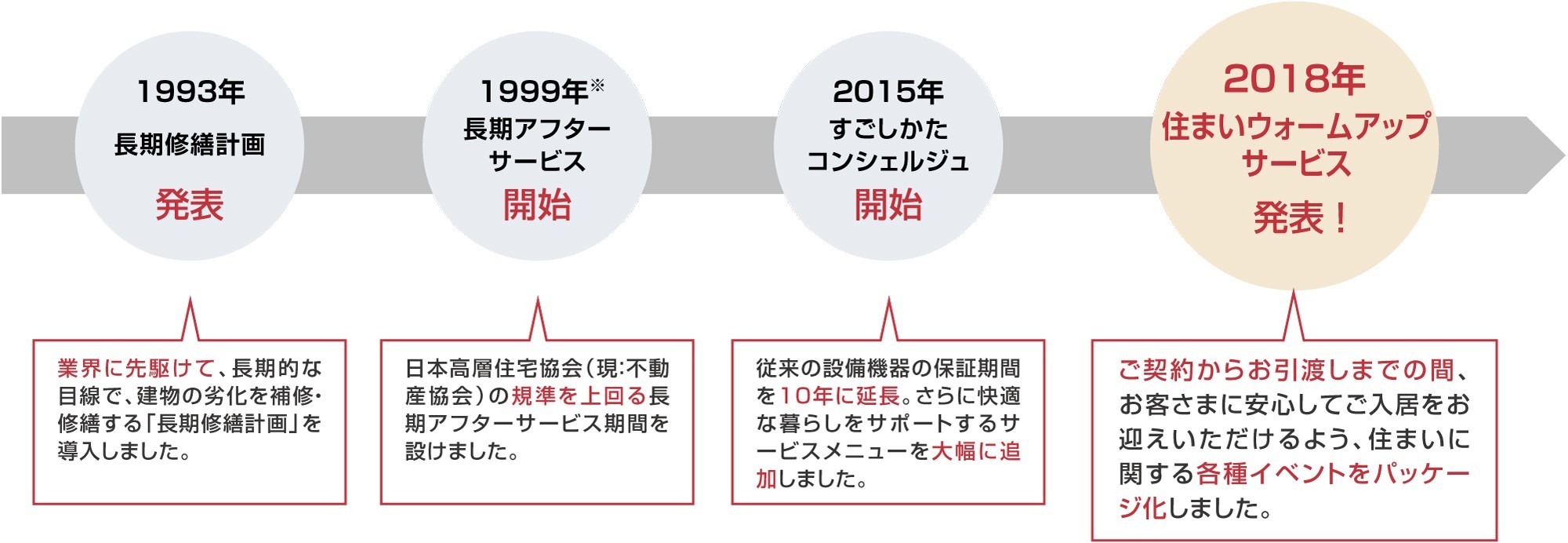 これによりご入居開始後に、マンションでご提供する提案型長期アフターサービス『すごしかたコンシェルジュ』や一戸建でご提供する『オーナーズサポート』などの既存サービスと合わせ、ご契約後からお引渡し、そして、ご入居後にいたるまで、一貫したサポートを提供してまいります。
