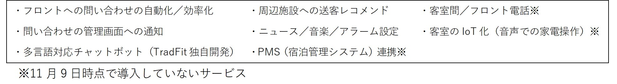 世界各地のお客さまにご利用いただいていることから、今般、全客室およびフロントにAIスピーカーを設置し、お客さまからのフロントへの問い合わせに対して多言語で対応できるようにしました。また、TradFitがホテル向けに開発・提供可能なサービスを付加し、AIスピーカーと連携した独自開発のチャットボットサービス(※1)を活用することで、お客さまへのさらなる利便性向上と業務オペレーションの効率化を図ります。