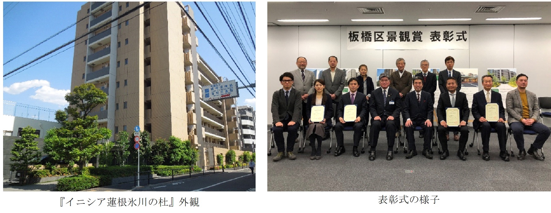 「板橋区景観賞」は、良好な景観の形成に寄与していると認められる建築物やまちづくり活動を表彰する制度で2019年に創設されました。初めてとなる今回の表彰は、板橋区景観計画が策定された2011年8月以降に板橋区と景観協議を行い、既に完成している民間の建築物を対象に評価が行われ、『イニシア蓮根氷川の杜』が第1回「板橋区景観賞」に選出されました。