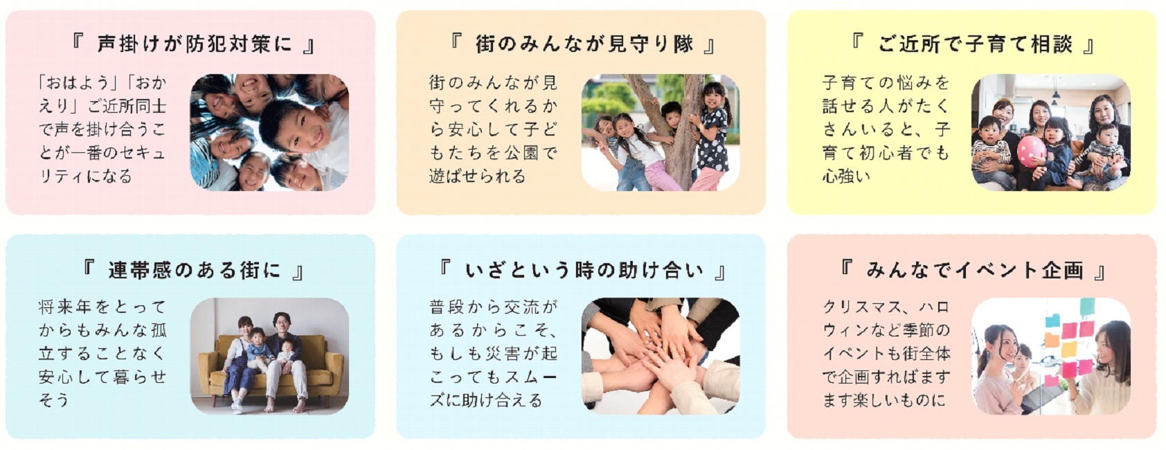 『グランフォーラム桃山台』は、大規模開発により誕生した新たな街であり、世代を超え、愛着を深めながら永く住み続け、巣立った後の子どもたちにとっても心の拠り所となるような、そんな街をめざして、ご近所同士のつながりが自然に深まるよう、コミュニティ形成支援を開始しました。緩やかで、あたたかなつながりによる「共助」の関係を構築することで、防犯・防災にも寄与する安心・安全な暮らしのためのコミュニティ形成を図ってまいります。