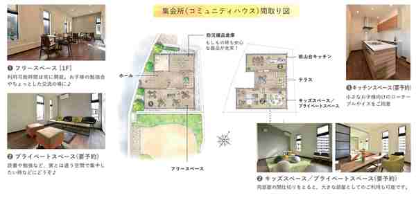 集会所は、フリースペースとして入居者に開放し、交流イベントの開催や団地管理組合の活動を行うコミュニティの拠点として、住民の「つながり」といざという時の「共助」が生まれる街づくりをめざします。
