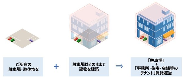 『SOLA CUBE』は、所有している土地や駐車場を有効活用したいとお考えの不動産オーナーさまに向けた、新しいソリューションです。コインパーキングなどの上空に鉄骨造の建物を建設し立体的に活用することで、駐車場賃料のみと比べて賃料収入の増加を提案します。また、駐車場部分は大和ハウスグループの大和ハウスパーキング株式会社のコインパーキングが運営可能です。設計施工を担当する株式会社コスモスモアは、工事金額を抑えながら、土地の価値を最大化するデザインを提案します。完成後の事務所・住宅・店舗等のテナントの賃貸運営・管理は株式会社コスモスイニシアが行うなど、大和ハウスグループによるワンストップサービスを実現し、不動産オーナーさまのニーズに応える土地活用を提供します。