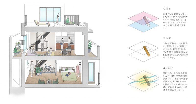 メゾネットでは、立体的な住戸プランの特性を存分に活かし、「わける・つなぐ・とりこむ」といった空間的な工夫により、暮らす人それぞれが仕事や好きなことに集中しながら、どこかつながりを感じる住まいを実現しています。住戸内のフロアが分かれることで、テレワークなど住まいの中で働くことが増えた現代の暮らし方に対応するほか、室内階段により上下階を緩やかにつないだ空間を演出したり、開口部を多く設けることで室内の通風・採光性を高めます。