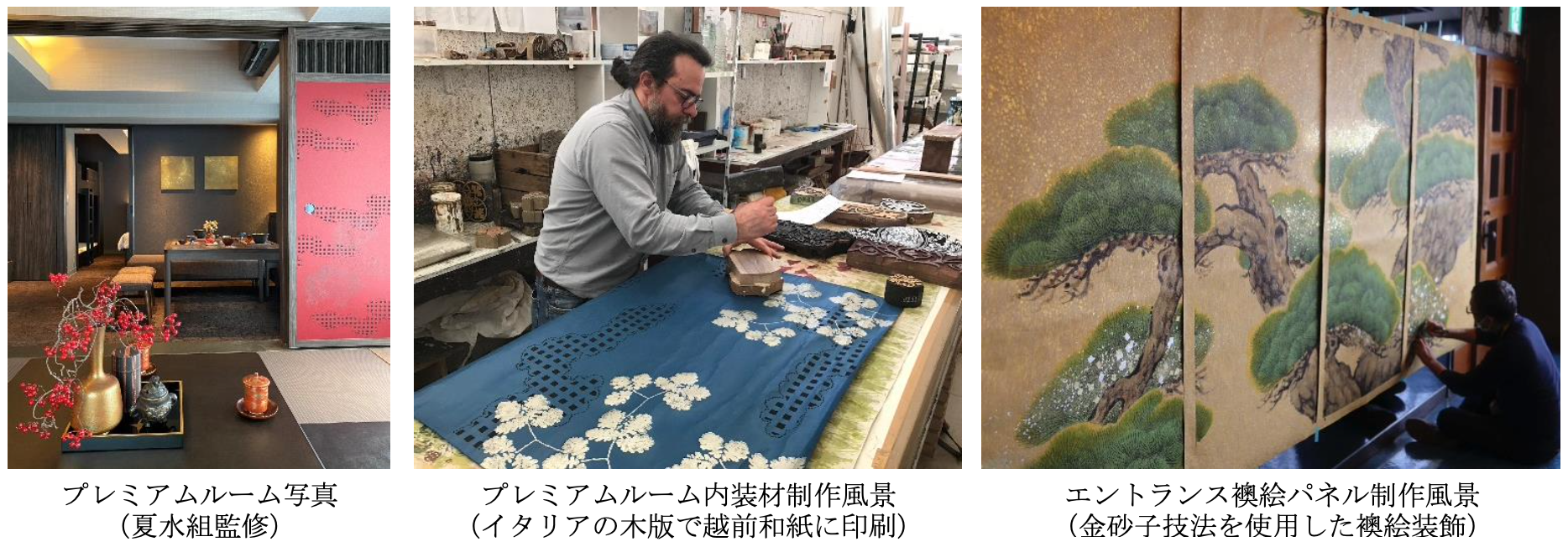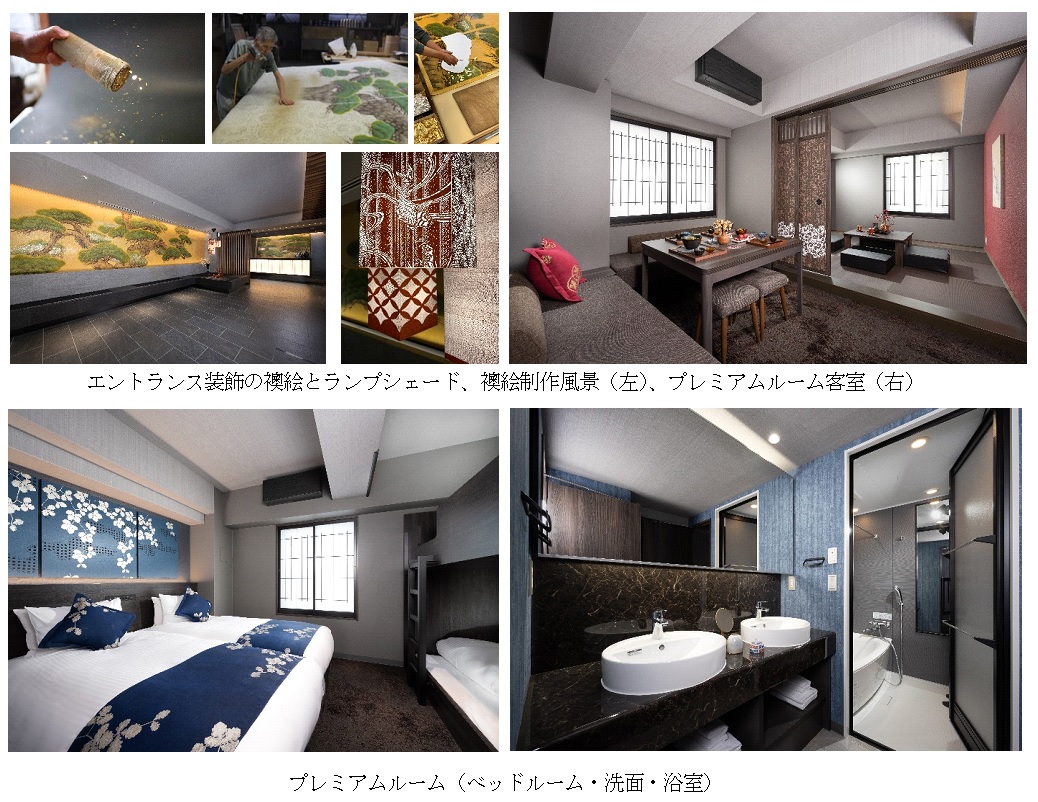 『MIMARU大阪 心斎橋WEST』は、夏水組が共用部やプレミアムルームのデザイン監修を行い、日本の伝統工芸を組み合わせた内装を施しています。ゲストをお出迎えするエントランスは、金箔を泊筒に入れ、散らして装飾する“金砂子”という技法で歌舞伎松を表現した襖絵と、重要無形文化財に指定される三重県の伊勢型紙を使ったランプシェードで装飾し、こだわりの空間としています。2タイプ4室ご用意したプレミアムルームでは、ルネサンス期から手彫木版でハンドプリントする伝統技術を継承し、今なおひとつひとつイタリアの職人の手によって作られた木版を制作し、福井県の越前和紙に印刷した襖紙を客室のベッドヘッドパネルと間仕切り扉に採用、ベッドスローとクッションも同柄としています。キッチン、洗面、トイレなどの水回りも統一感をもたせ、モダンジャポニズムスタイルを実現しています。