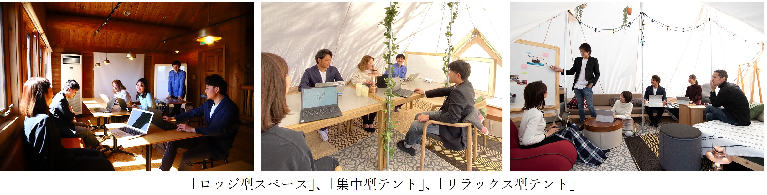 - 「ロッジ型スペース」・「集中型テント」・「リラックス型テント」をご利用者ごとに占有使用いただくため、他の利用者の視線を気にすることなく、集中してミーティングを行うことができます