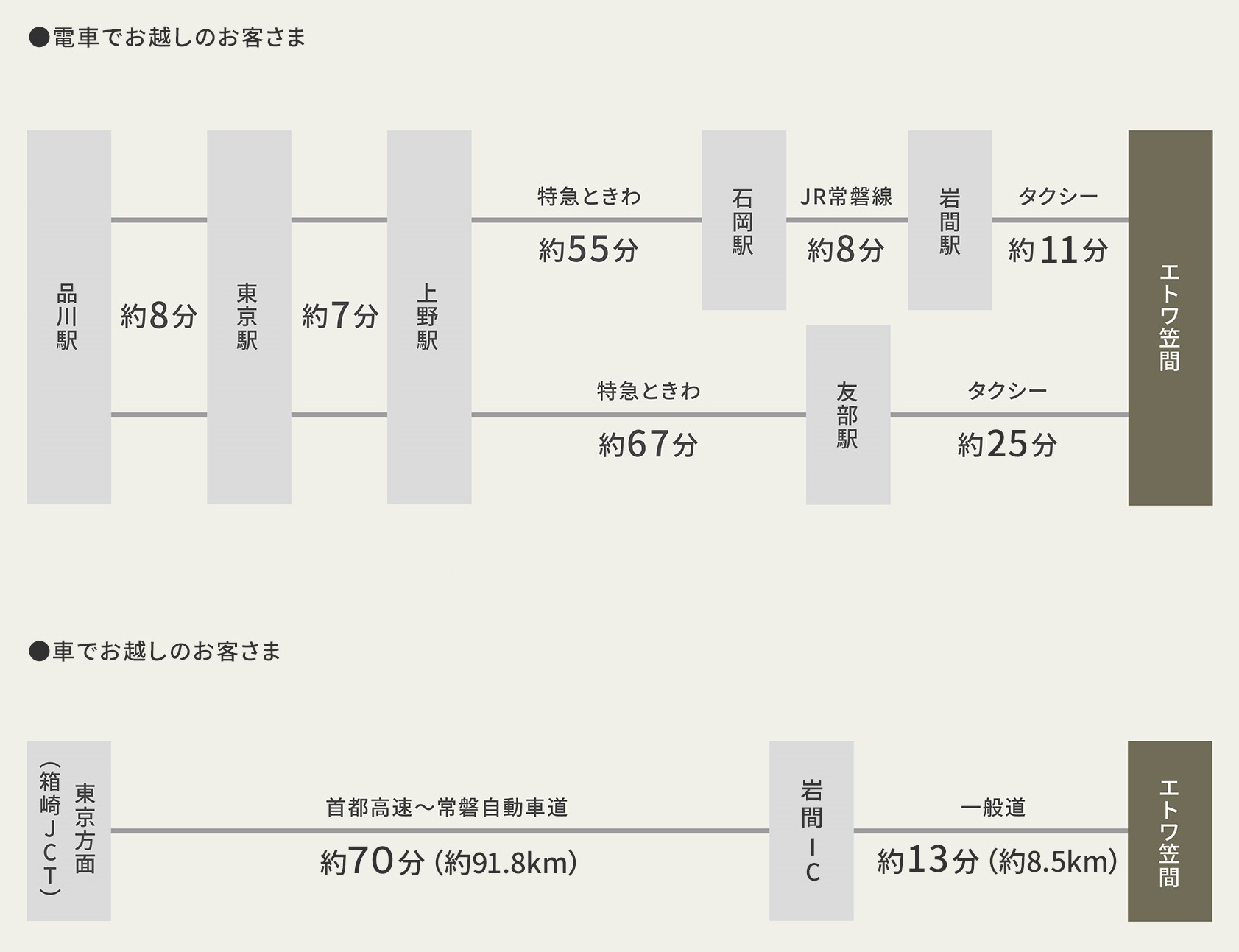 東京から現地まで約90分でアクセス可能。電車でも車でもお越しいただけます。