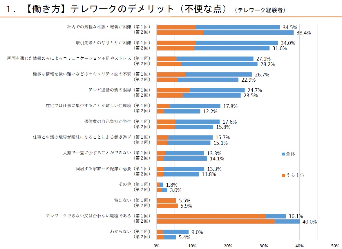 内閣府が、2020年12月に実施した「第2回 新型コロナウイルス感染症の影響下における生活意識・行動の変化に関する調査」によると、テレワークのデメリット(不便な点)について、以下のような結果が見られました。