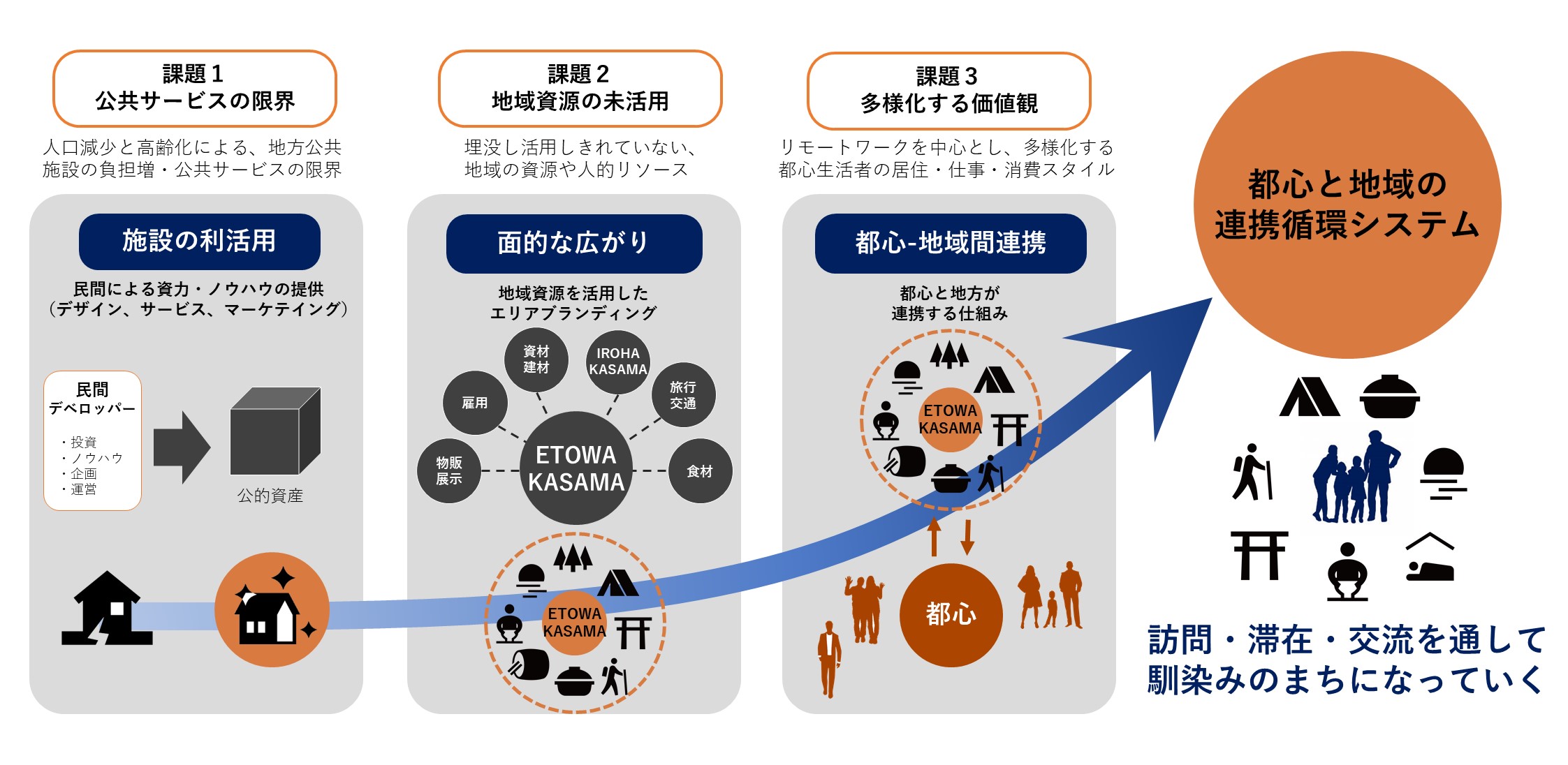 茨城県笠間市の公共施設利活用を中心にした官民連携の地域活性化プロジェクト。民間のノウハウや資力を生かし、公共宿泊施設を滞在拠点施設「ETOWA KASAMA」としてバリューアップ。運営において地域の資源・人材や、地域内の他の空き施設も活用して新しい働き方も提案。都市と地域を交流させる地域循環システムをめざした。