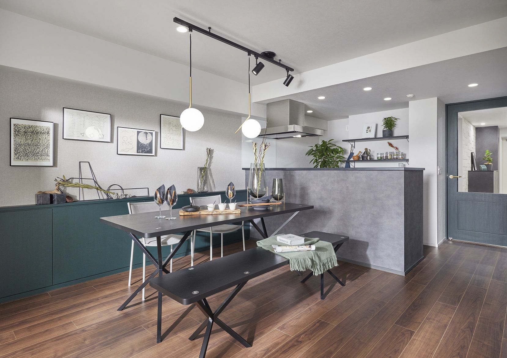 朝夕の陽光で表情を変化させるブラックウォルナットの床材に、深緑をアクセントに効かせた、ミニマライズされたクラシックスタイル。気品ある落ち着きを演出します。