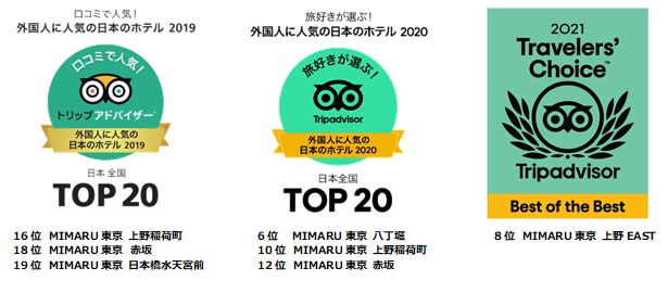 MIMARUでは、世界最大の旅行プラットフォーム「TripAdvisor®」の日本法人であるトリップアドバイザー株式会社が発表した「2021トラベラーズチョイス ベスト・オブ・ザ・ベスト ホテル」において「MIMARU東京 上野EAST」が日本のベストホテル8位に、また、同社が発表した「インバウンドレポート2020」「インバウンドレポート2019」にて「旅好きが選ぶ!外国人に人気の日本のホテル」ランキングTOP20に3施設が選出されました。これらは、世界中から投稿される口コミと評価をもとに、旅行者から最も高い評価を受けた施設を表彰するものです。