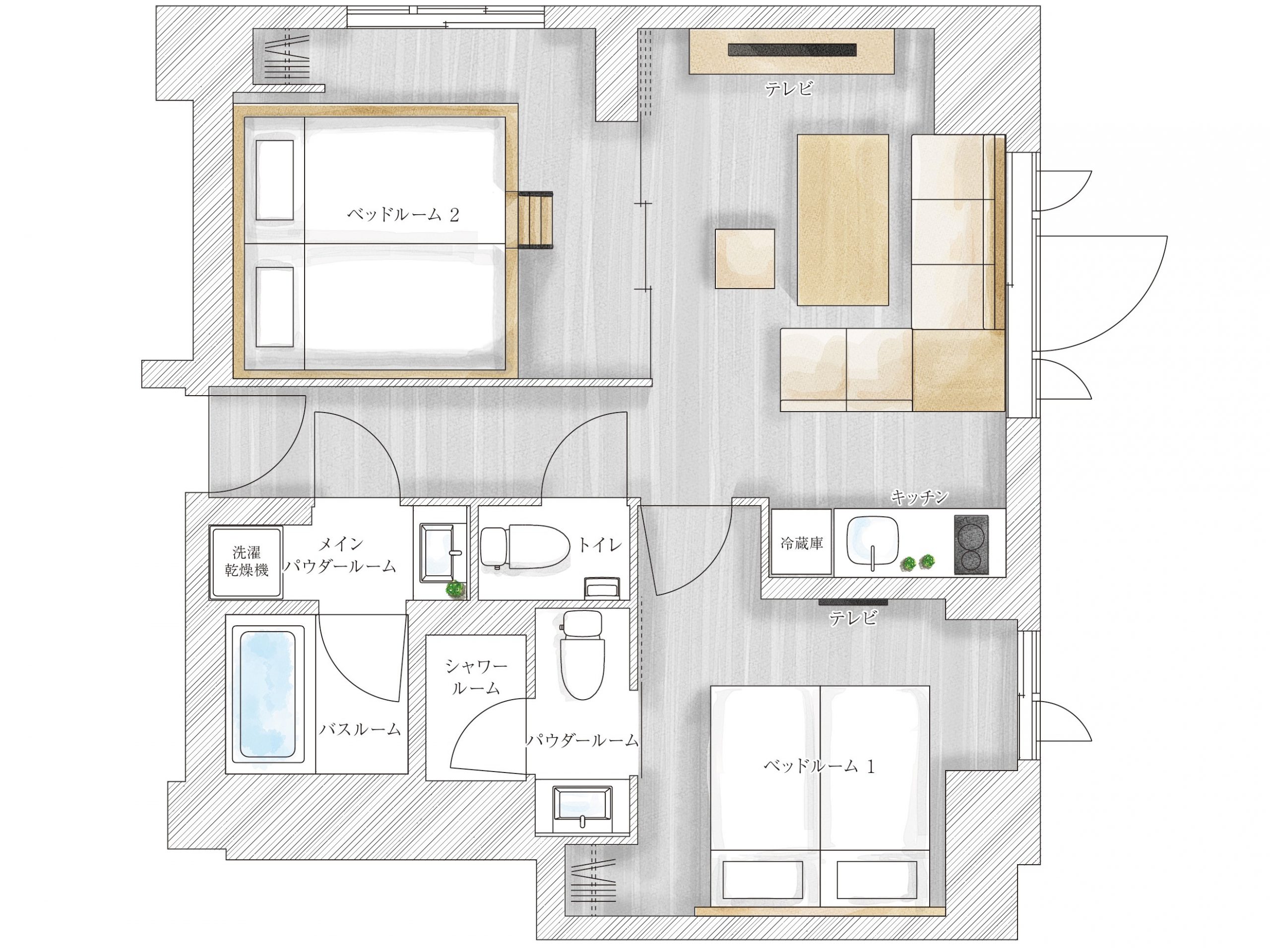 全室リビング・ダイニングに加え、2つ以上のベッドルームで構成されたスイートタイプの客室。みんなで集まるリビング空間と、プライベート空間の双方を備えるため、多人数で同室に泊まる楽しさと、それぞれがくつろぐ時間を大切にできます。