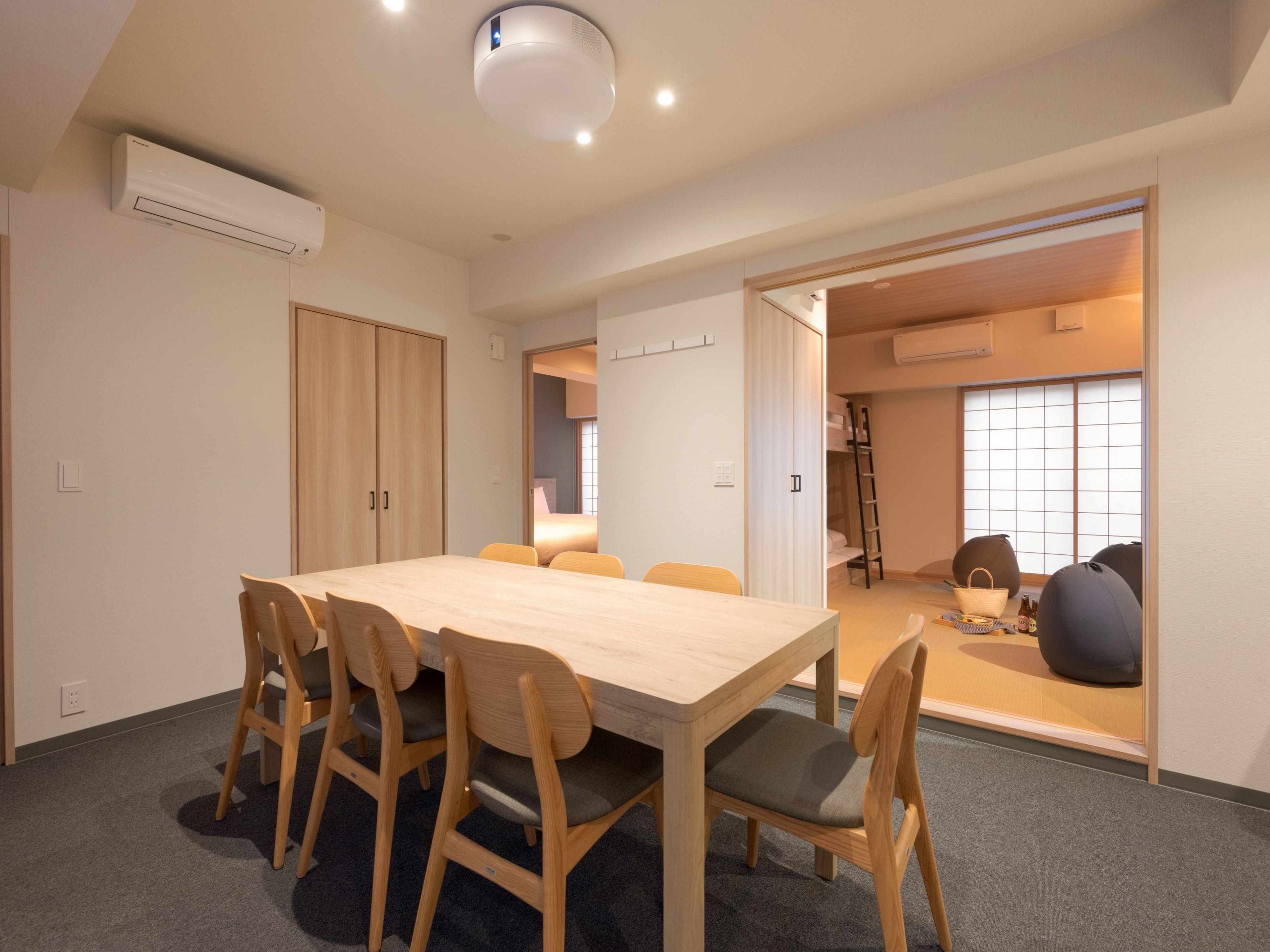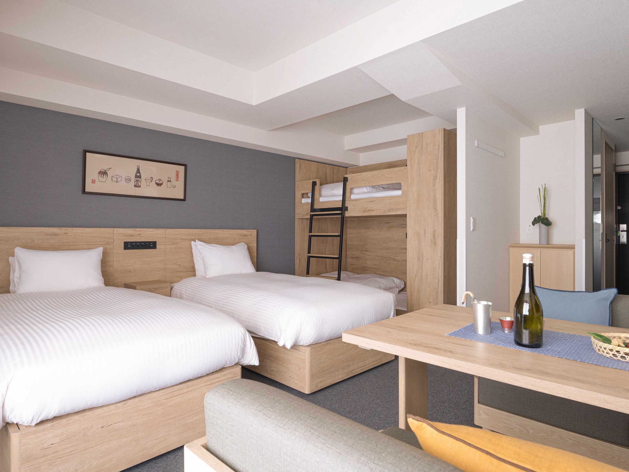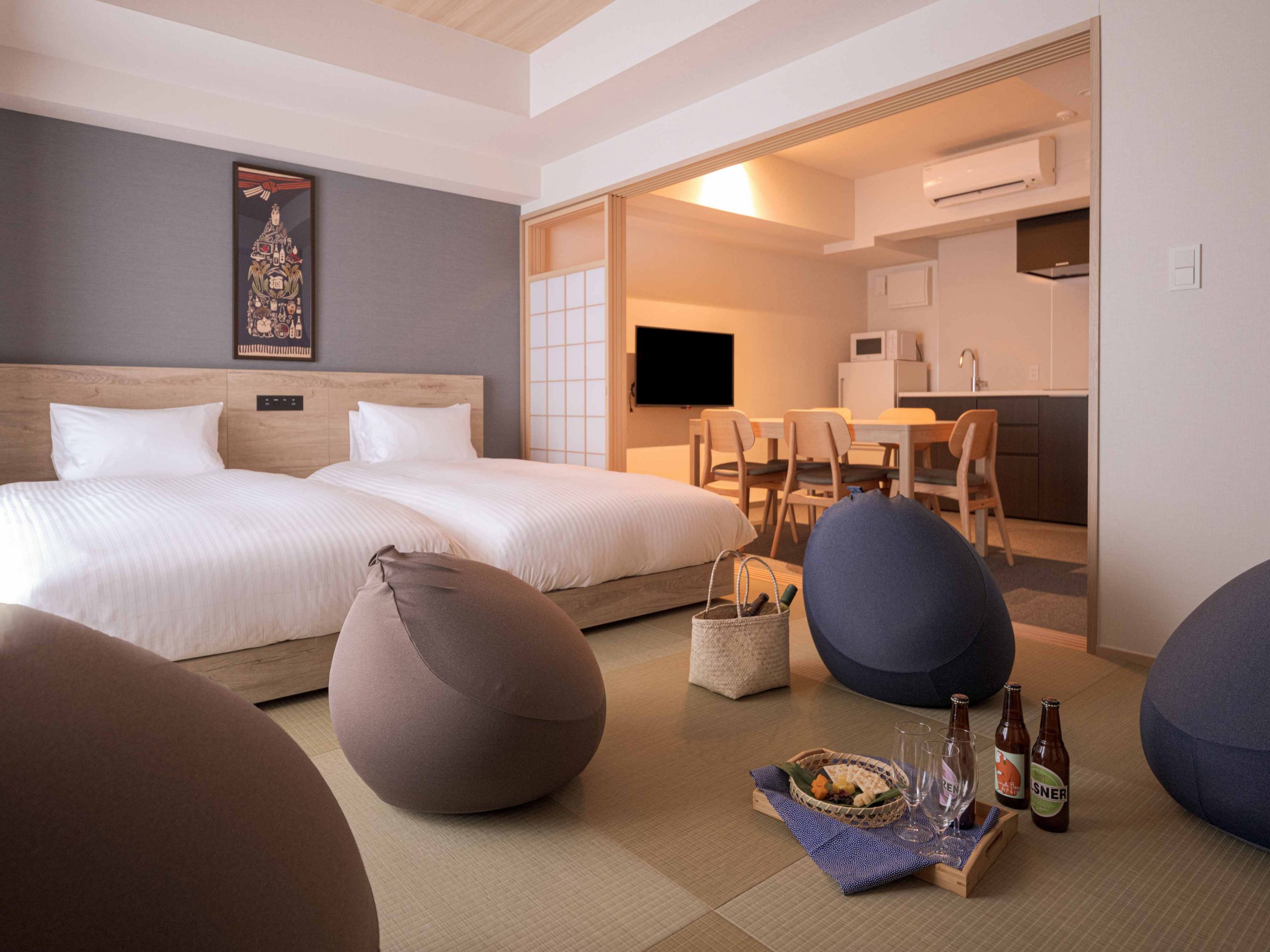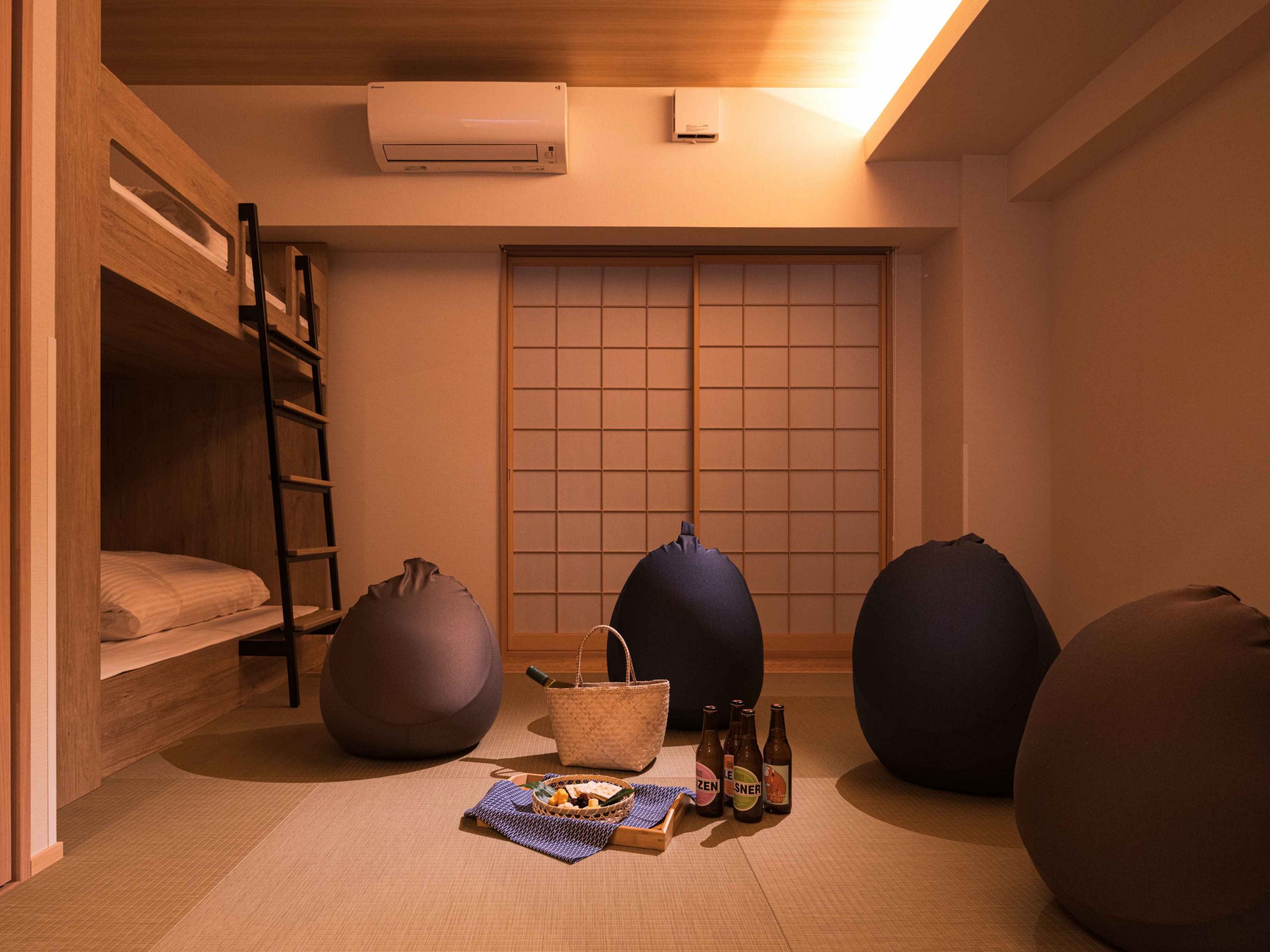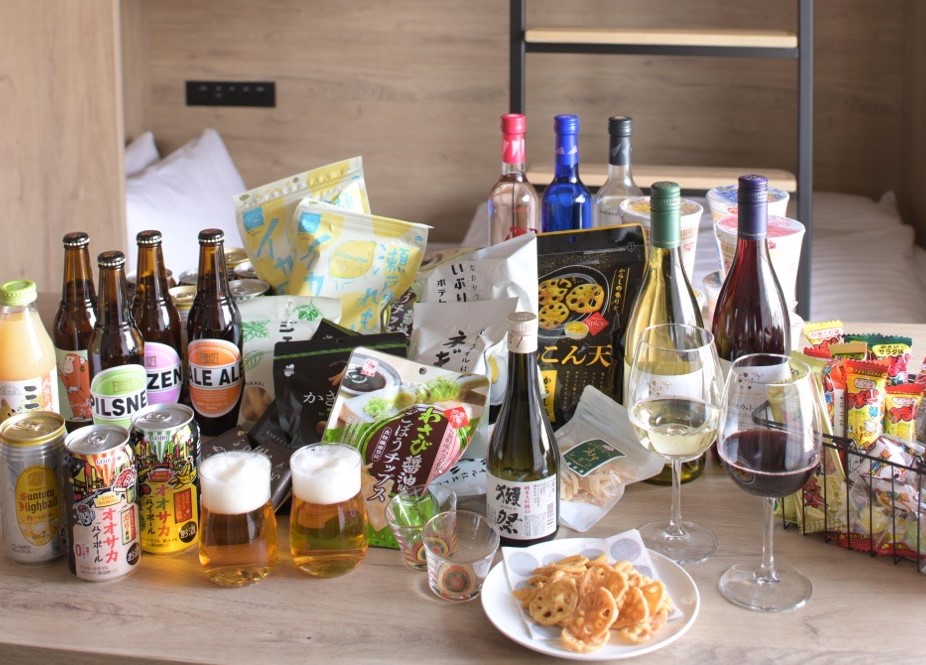 『MIMARU大阪 心斎橋EAST』は、定員4~7名の広いお部屋で、海外のファミリーはもとより、友人同士、学生時代の仲間、子どもの成人されたご家族など、美味しいお酒や食とともに、“みんなで泊まる”旅をお楽しみいただけます。和室で車座になり、まったりと飲んだり食べたりできるコンセプトルーム「まどいの極み部屋」もご用意しました。日本酒やビールといったアルコール、駄菓子、スナック、ナッツ類などのおつまみを、あらかじめお部屋にセット(無料)してあるので、買い出しに行く手間もなく、お部屋に入ったら、すぐに「ほろ酔い」時間をスタートできます。